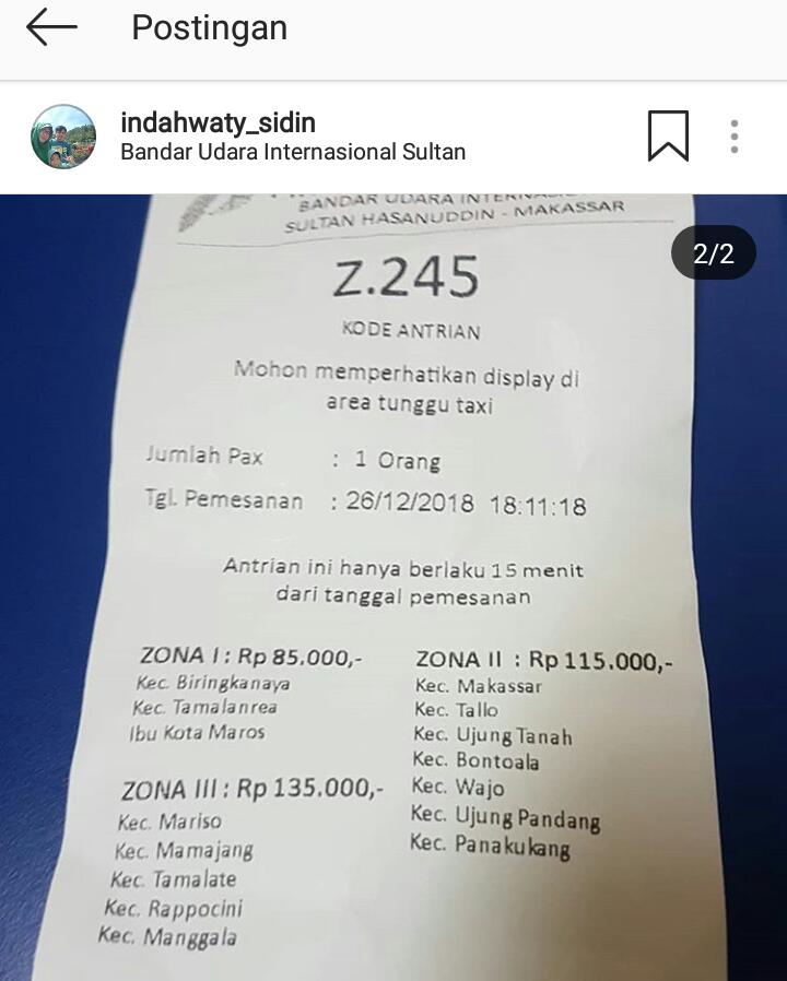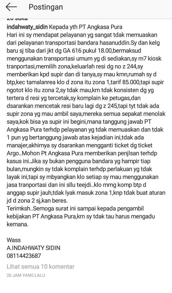 hari ini saya mendapat pelayanan yang sangat tidak memuaskan dari pelayanan trasnportasi bandara sultan hasanuddin, saya dan keluarga baru saja tiba dari jakarta dengan Pesawat GA 616 pukul 18.00, bermaksud menggunakan trasnportasi umum yang di sediakan, saya menuju kios transportasi, memilih zona, keluarlah resi dengan no. 244, saya memberikan kepada supir dan ditanya, saya mau kemana, rumah saya di BTP, kecamatan Tamalanrea kalau zona itu zona 1, tarif Rp 85.000, tapi sopir ngotot kalau itu zona 2 saya tidak mau, karena tidak konsisten dengan yang tertera diresi yang tercetak, saya komplain ke ke petugas, dan disarankan mencetak resi baru lagi dgn no. 245, tapi tidak ada sopir yang mau ambil saya, mereka menolak saya, kok bisa ya sopir ini begini, mana tanggung jawab angkasa pura terhadap pelayanan yang tidak memuaskan dan tidak 1 pun yang bertanggung jawab atas kejadian ini.