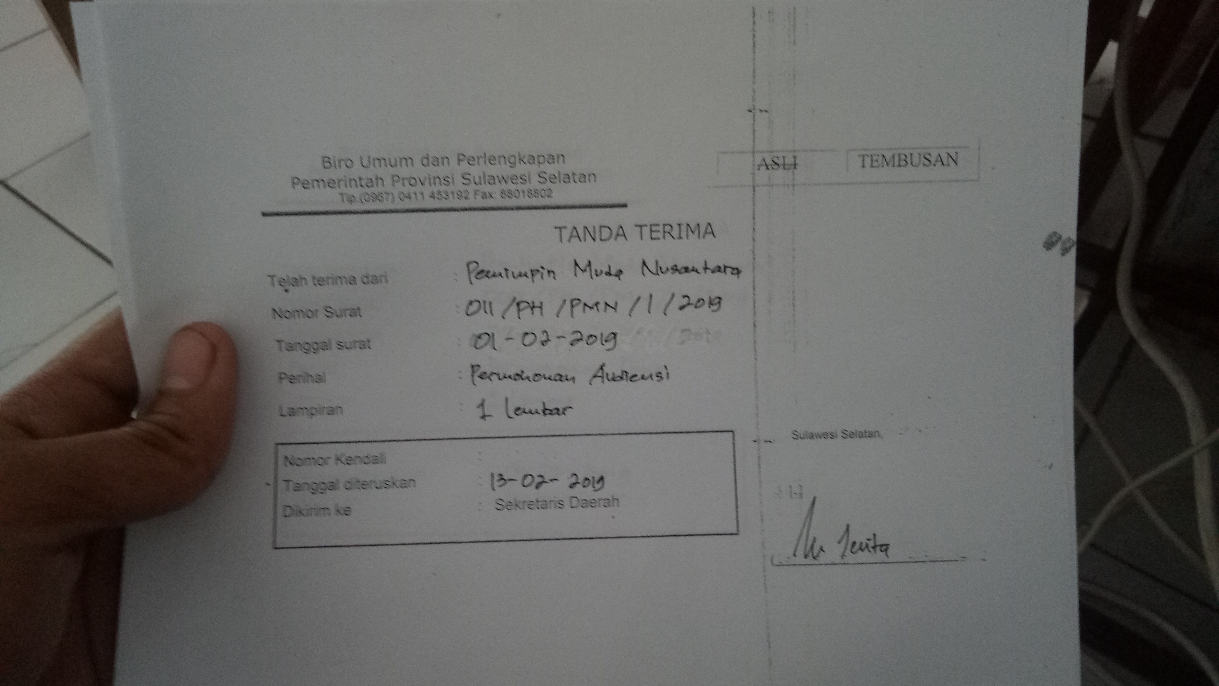 Kak, saya mau tanya tentang surat saya tentang permohonan audiensi dengan nomor surat 011/PH/PMN/I/2019 dan permohonan dana dengan nomor surat 009/PH/PMN/I/2019 yang masuk pada pada 13-02-2019. Semoga bisa bertemu Gubernur Sulawesi Selatan kak.. ????????????